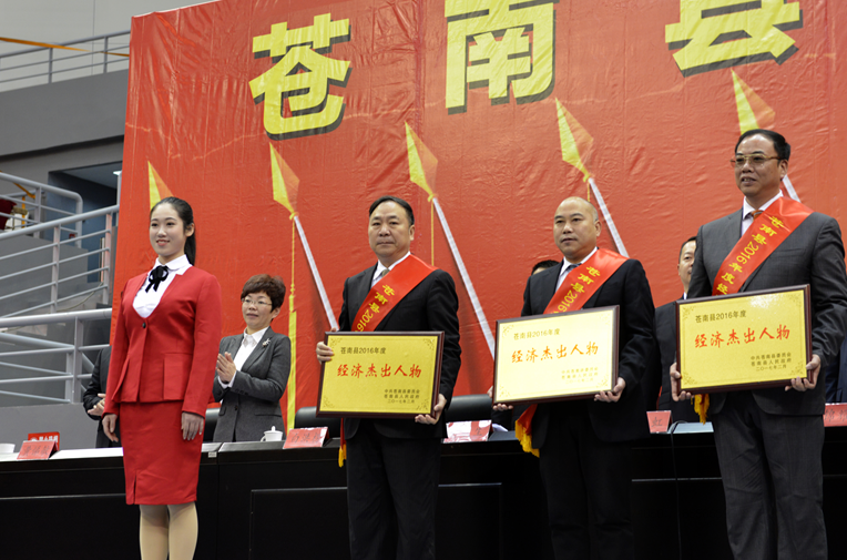 2月4日上午,苍南县三级干部大会在县体育馆隆重举行,此次会议由县委副书记、代县长郑建忠主持,县委书记黄荣定、县四套班子领导、全县乡(镇)、村居(社区)和企业等近5000人参加,为苍南建县历史上规模最大、人数最多、层次最高的一次会议。会上,县人民政府授予天信为2016年度突出贡献企业,授予天信总裁范叔沙为2016年度经济杰出人物。