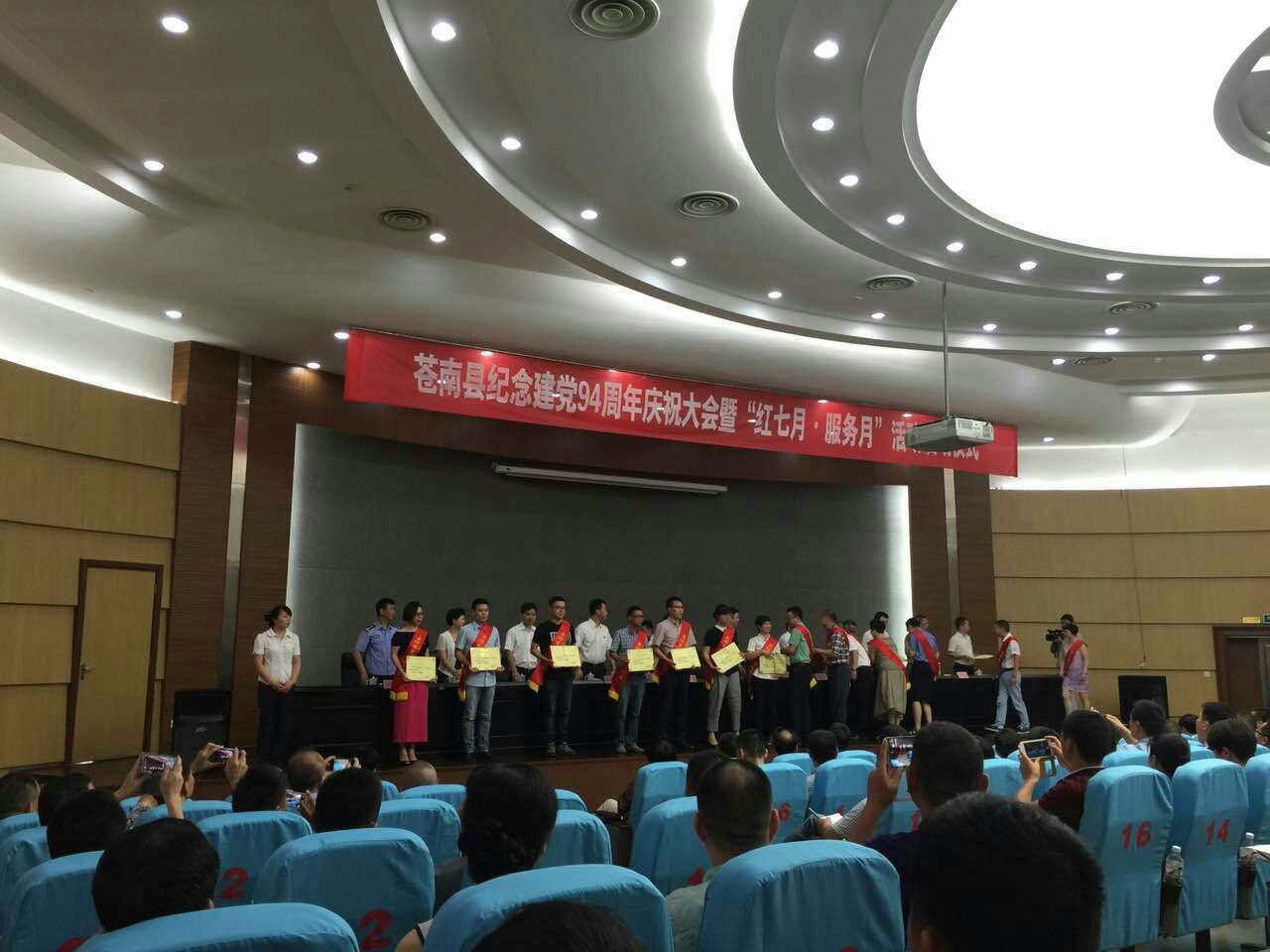 7月1日,在苍南县纪念建党94周年暨“红七月服务月”启动仪式上,天信党委被中共苍南县委表彰为“先进基层党组织”荣誉称号。同时,公司员工黄华同志被表彰为县优秀党务工作者。